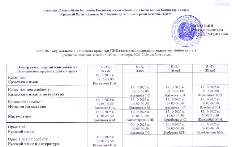 2025-2026 1 токсанға арналған ТЖБ тапсырмаларының орындалу мерзімінің кестесі